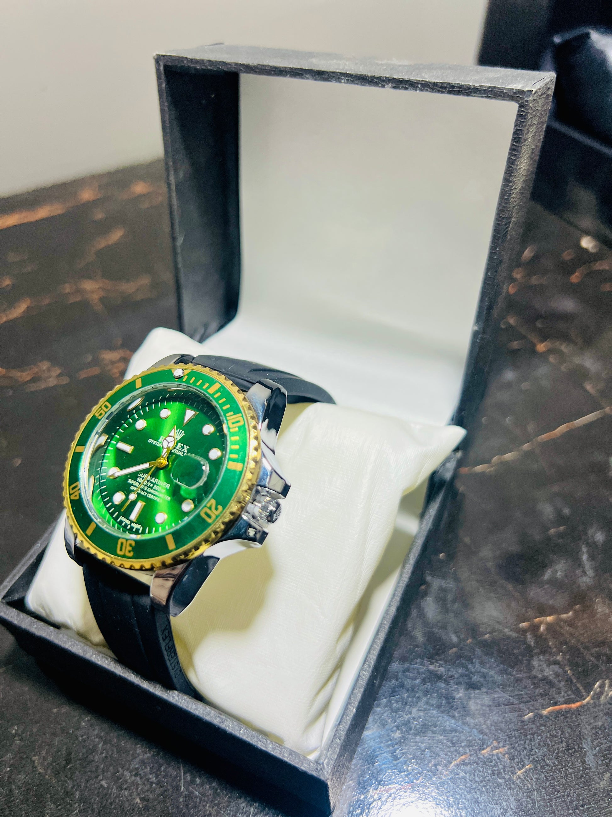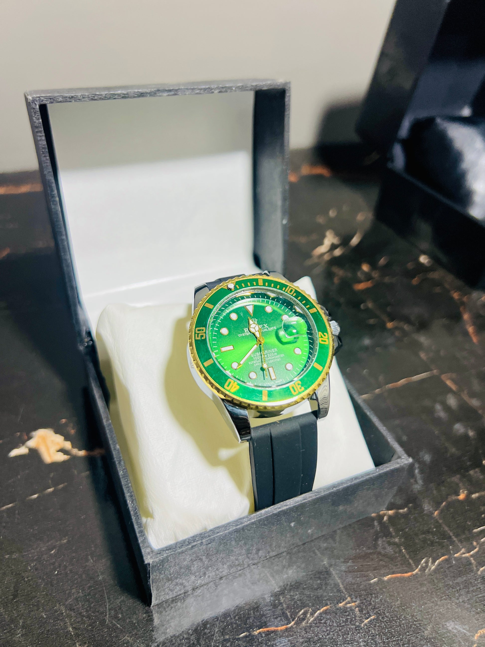 Make a bold statement with this stunning Rolex, featuring a vibrant green dial with a yellow bezel and a sleek black rubber strap. Perfect for those who demand style and precision in every moment.